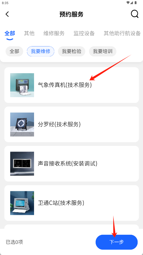 3、在维修服务列表勾选需要维修的设备,点击右下角“下一步”按钮提交预约。