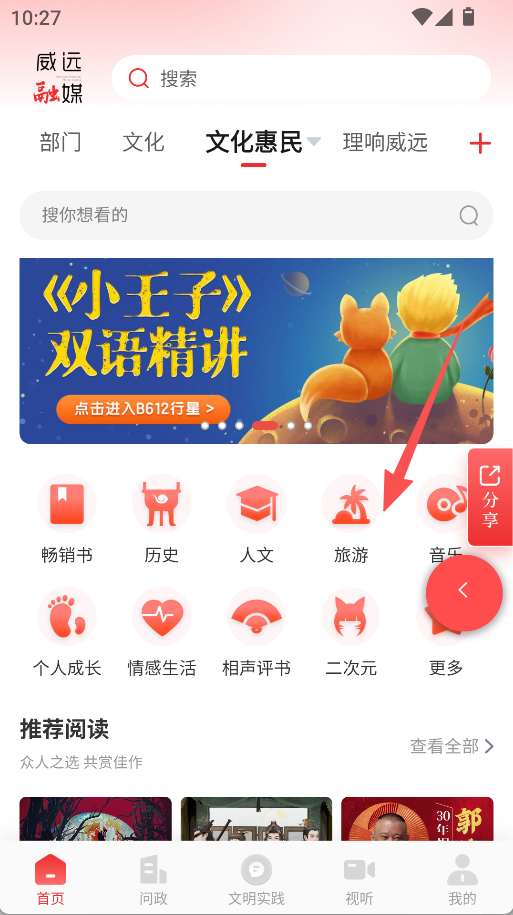 1、进入文化惠民点击旅游,浏览旅游类内容。