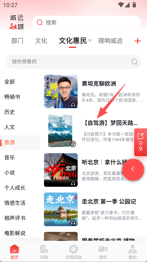 1、文化惠民板块内容丰富,旅游类等分类下文章多样,如自驾游内容,可读性强。