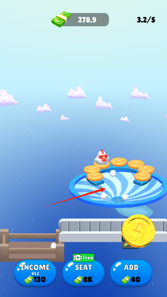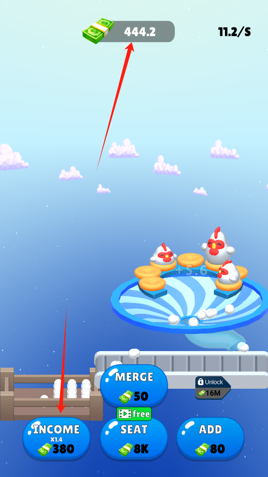 1、游戏中,点击屏幕使小鸡加速产蛋,产出的蛋可以增加收益,收益的资金可以用来购买位置和小鸡。