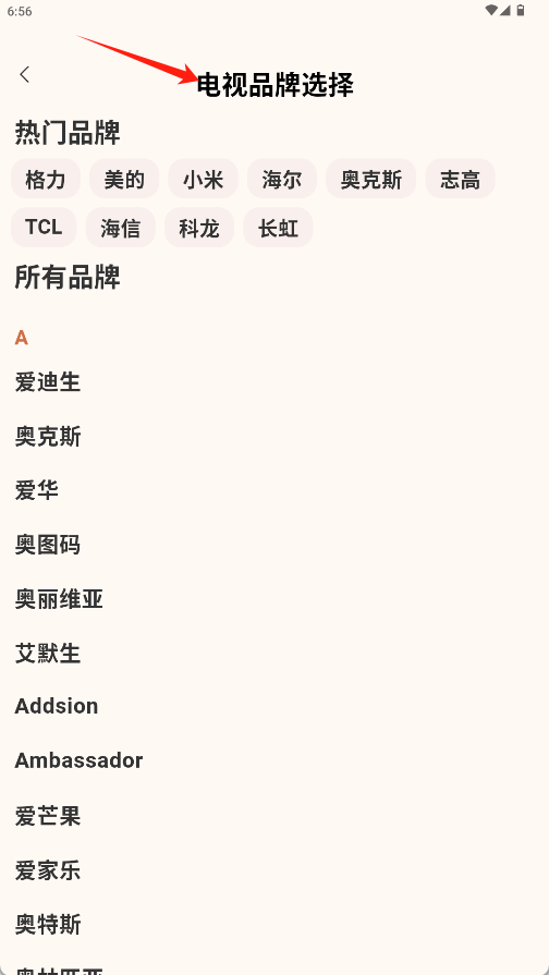 3、进入电视品牌选择页面,从所有品牌列表中点击对应的品牌名称完成添加。