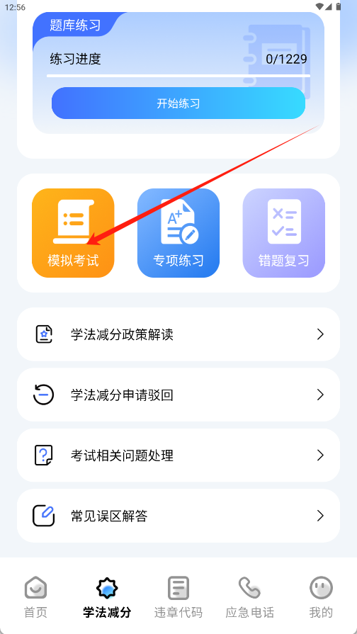 1、在学法减分页面点击“模拟考试”图标,进入考试界面。