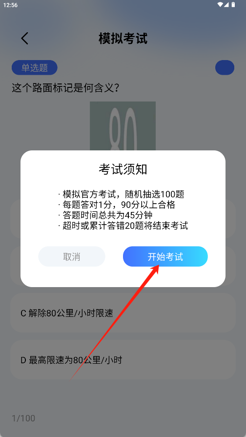 2、仔细阅读弹出的考试须知内容,了解规则后点击“开始考试”按钮。