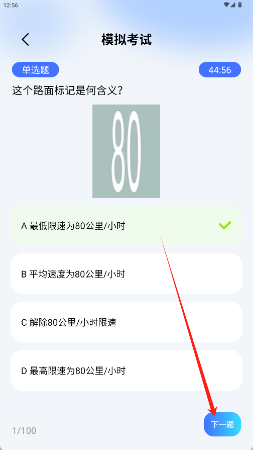 3、进入答题界面后根据题目选择正确答案,后点击“下一题”进行做题。