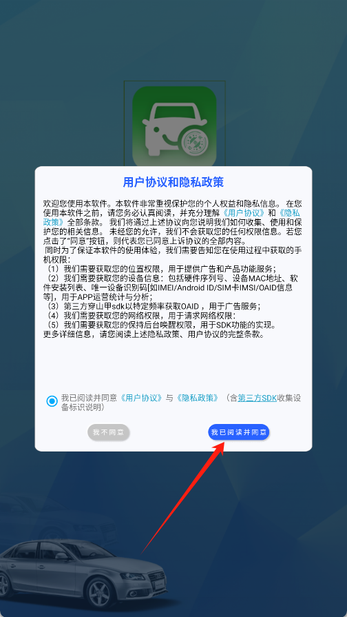 1、首次打开软件,在隐私协议弹窗中点击“我已阅读并同意”完成授权。