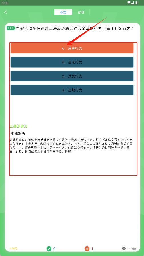 3、在答题界面阅读题目并选择答案(如第1题选A),系统会自动判断对错并显示解析。