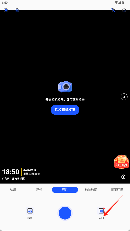 1、智能水印功能自动获取当前时间、精确定位地址及实时天气数据并合成到照片中。