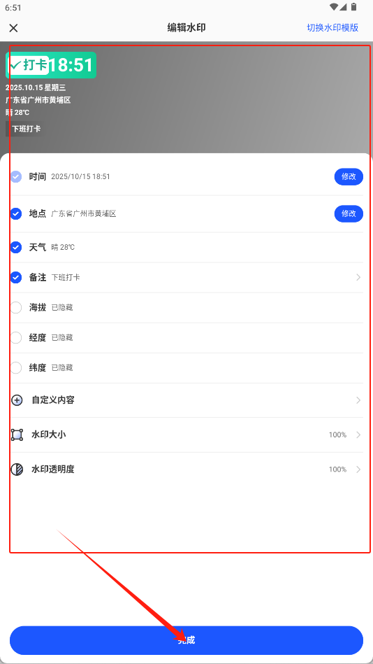 2、水印信息自动获取系统数据,时间戳、地理位置、天气状况等元素无需手动输入即可生成。