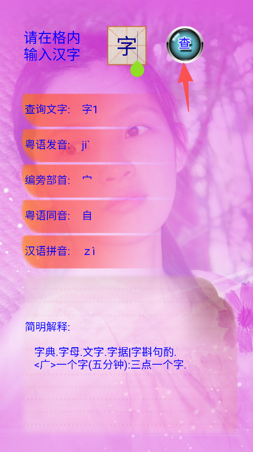 1、在格内输入汉字、点击查按钮、获取汉字粤语发音及相关信息。