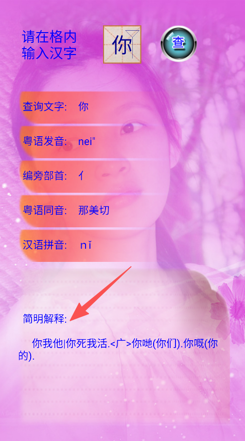 2、查看查询结果、包含粤语发音、偏旁部首、汉语拼音及简明解释。