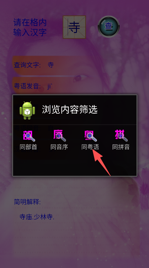 2、支持内容筛选,能按同部首、同音序、同粤语、同拼音等条件筛选汉字,便于归类学习。
