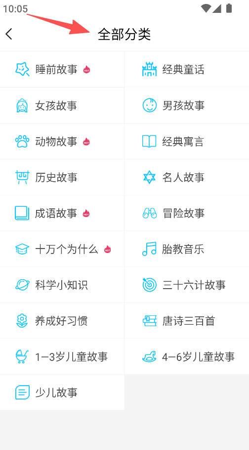 1、进入全部分类、选择故事类别(如动物故事)、进入类别页面。
