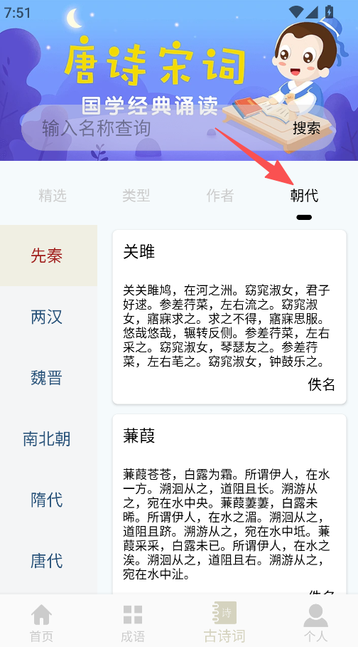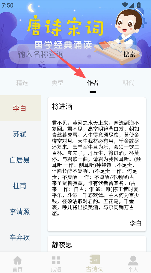 1、进入古诗词板块、选择作者或朝代分类、查找目标诗词。