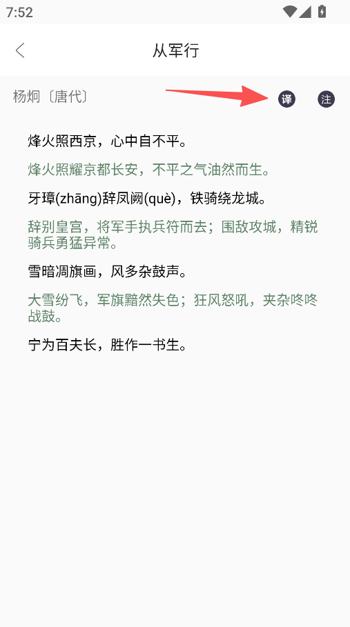 3、在详情页点击译或注、查看诗词翻译或注释、深入理解内容。