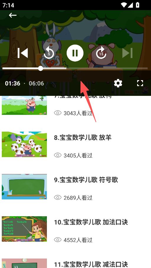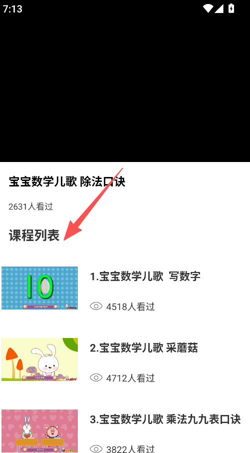 2、在课程列表、选择目标儿歌(如写数字)、进入播放界面。