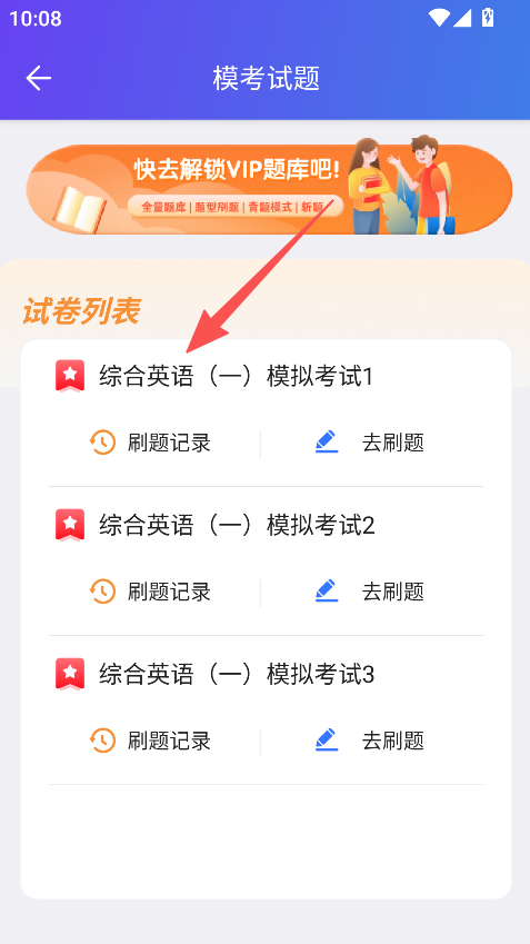 1、进入首页、点击模考试题、进入试卷列表。