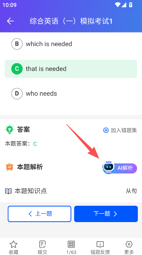 3、在答题界面、点击AI解析、查看题目解析。