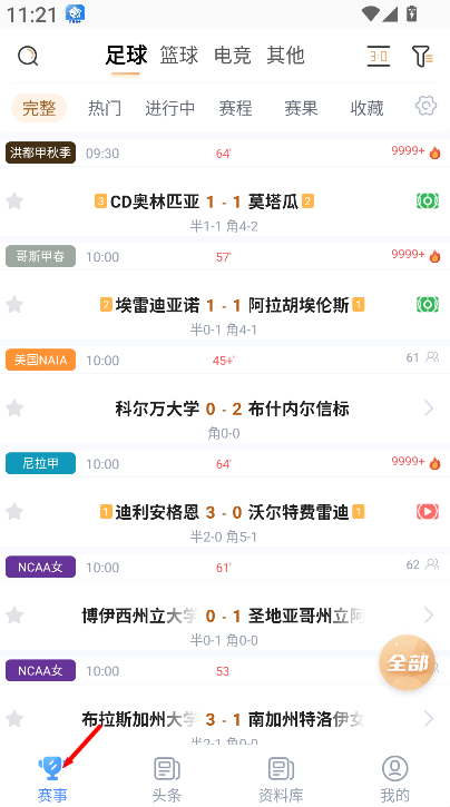 1、进入软件首页后,可查看各类体育赛事的最新情况,包括赛程安排、实时比分及比赛结果等信息。