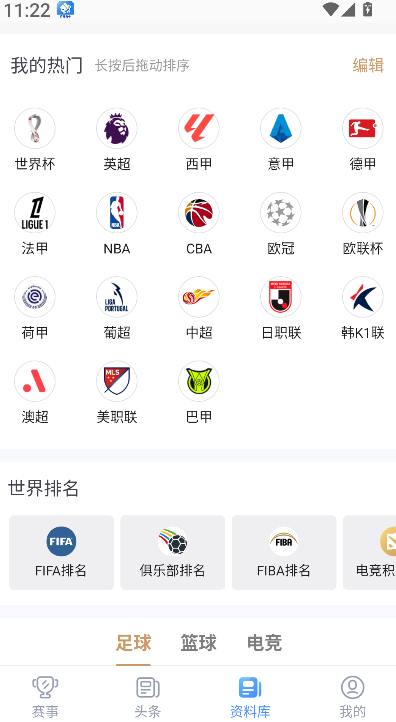 3、进入资料库板块,可查看各项体育项目的世界排名与相关统计数据,便于掌握运动员及球队的实力对比。