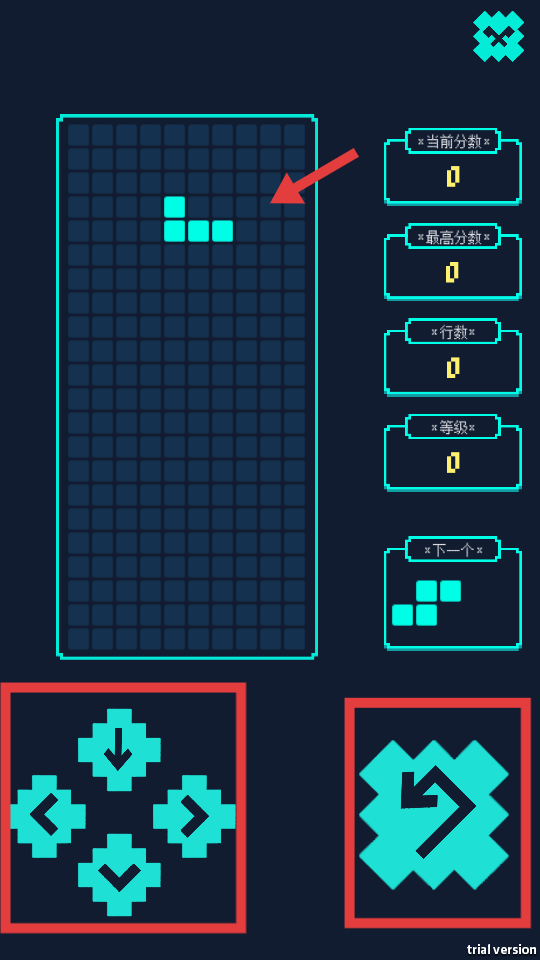 1、游戏开始,借助左下方向键操控方块移动与变换,控制方块下落。