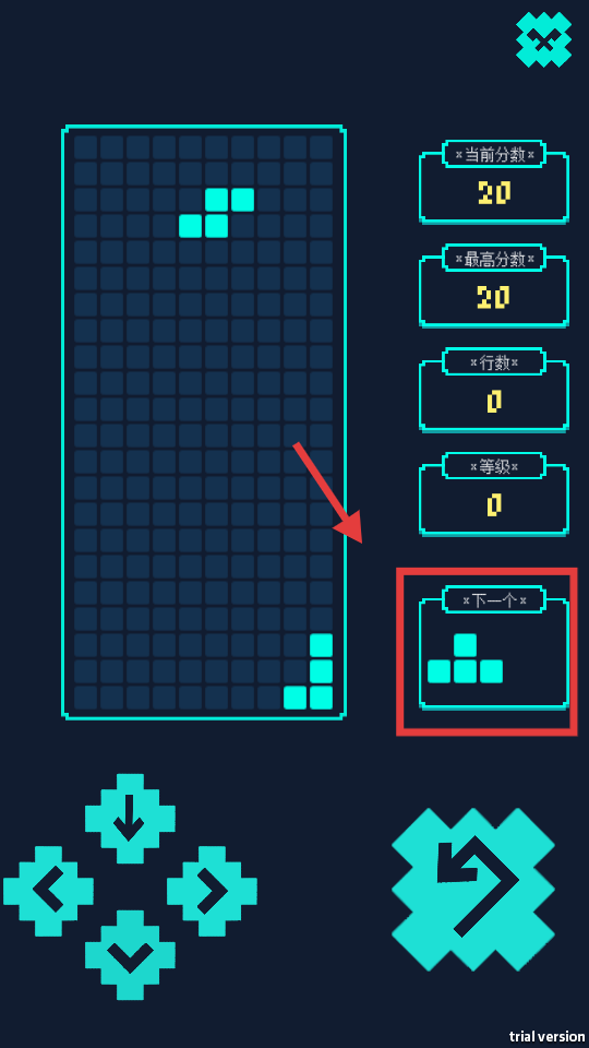 2、方块落下后,可同时留意【下一个】方块的形状,提前规划后续方块的摆放。