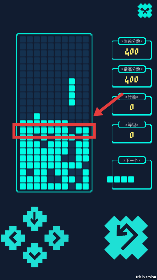 3、尽量让方块堆叠整齐,通过填满横向的行来消除方块,以此高效积累分数。