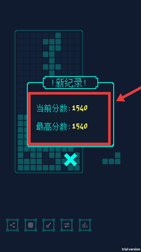 4、游戏结束会弹出【纪录】提示,显示【当前分数】和【最高分数】,可继续挑战突破得分。