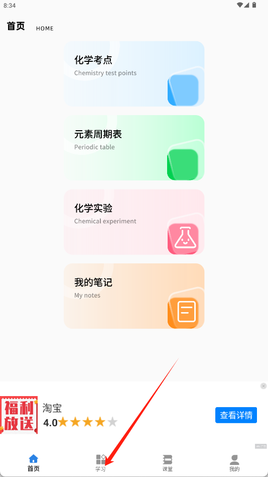 1、在首页底部导航栏中,点击所指的“学习”进入学习页面。