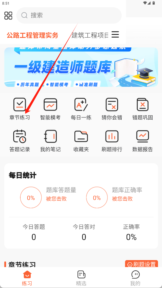 1、在首页点击“章节练习”功能图标进入练习选择界面。