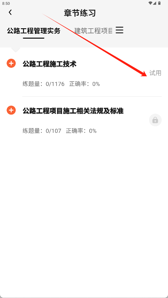 2、在科目列表中选择目标科目,点击章节右侧的“试用”开始练习。