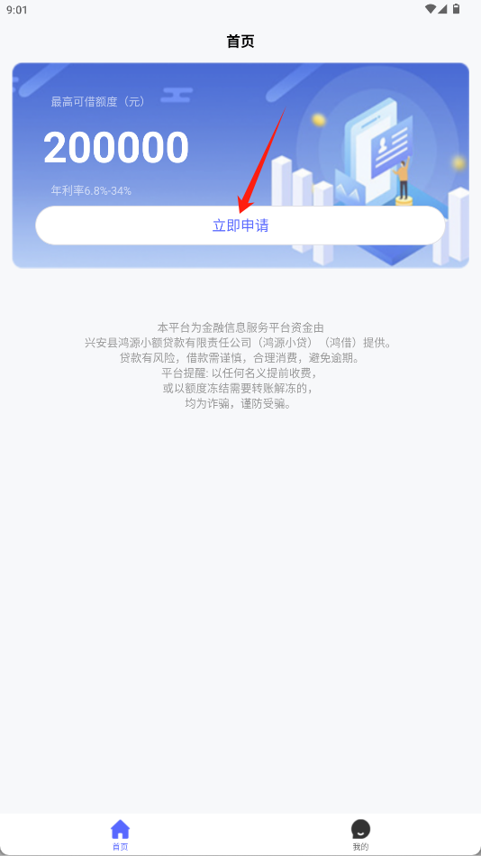 2、登录成功后进入首页,点击“立即申请”按钮开始借款流程。