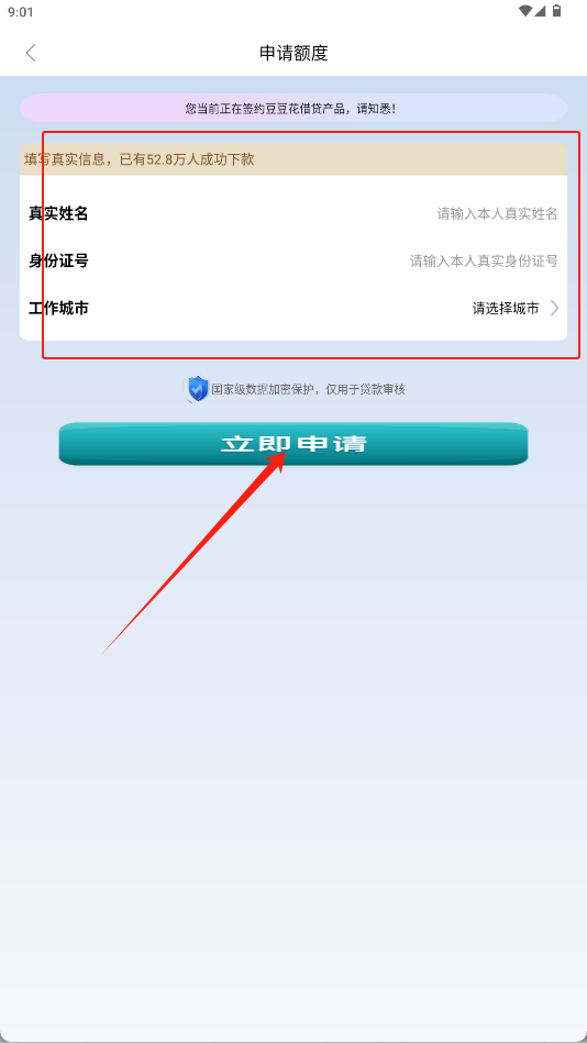 3、在申请额度页面按要求填写真实姓名、身份证号及工作城市等必要信息,确认后点“立即申请”提交审核。