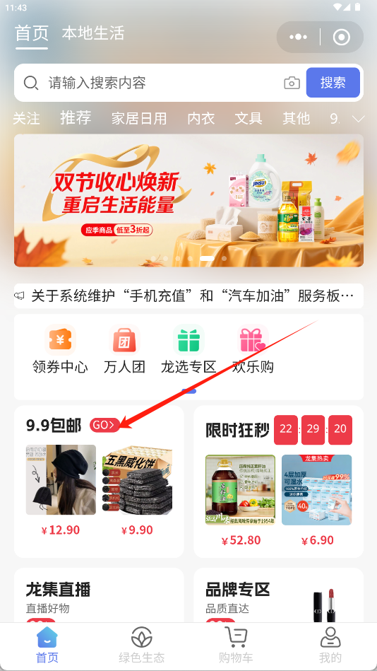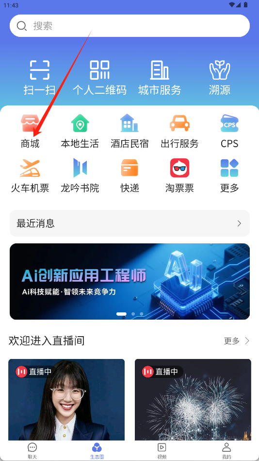 1、在首页浏览各类商品与活动入口,找到并点击“商城“按钮。