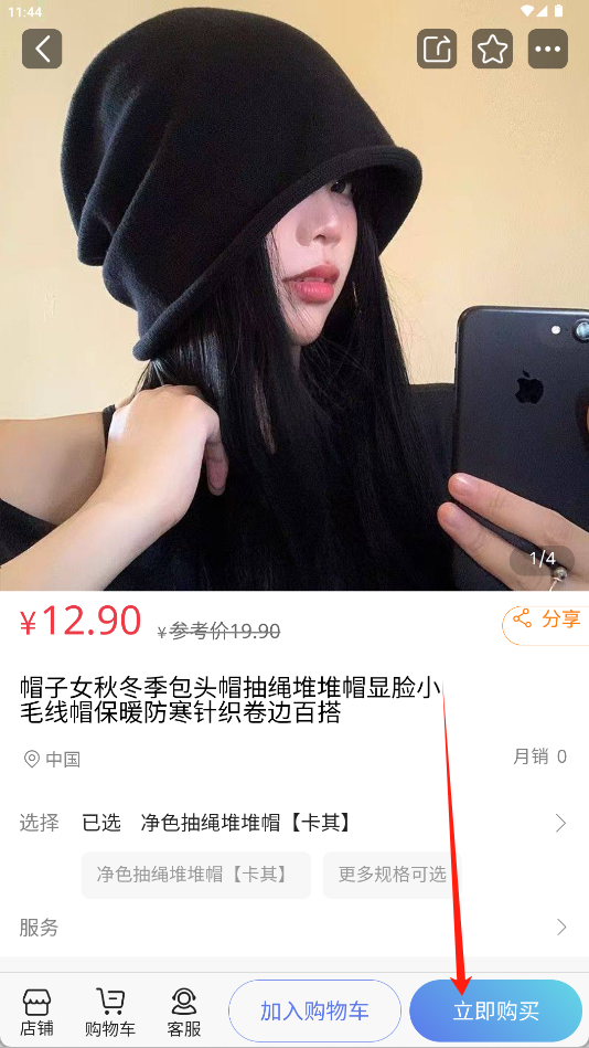 3、在商品详情页确认规格、价格等信息后,“立即购买”按钮完成下单。