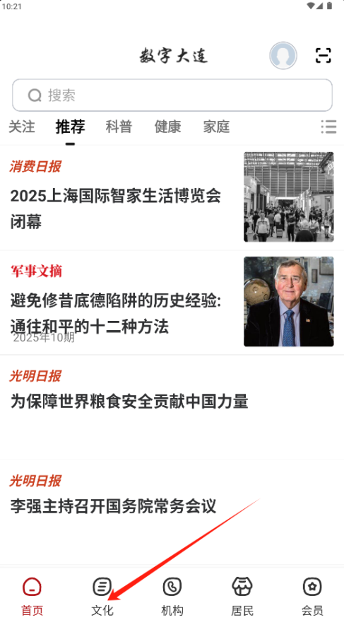 1、在首页底部导航栏中,点击“文化”按钮进入文化服务页面。