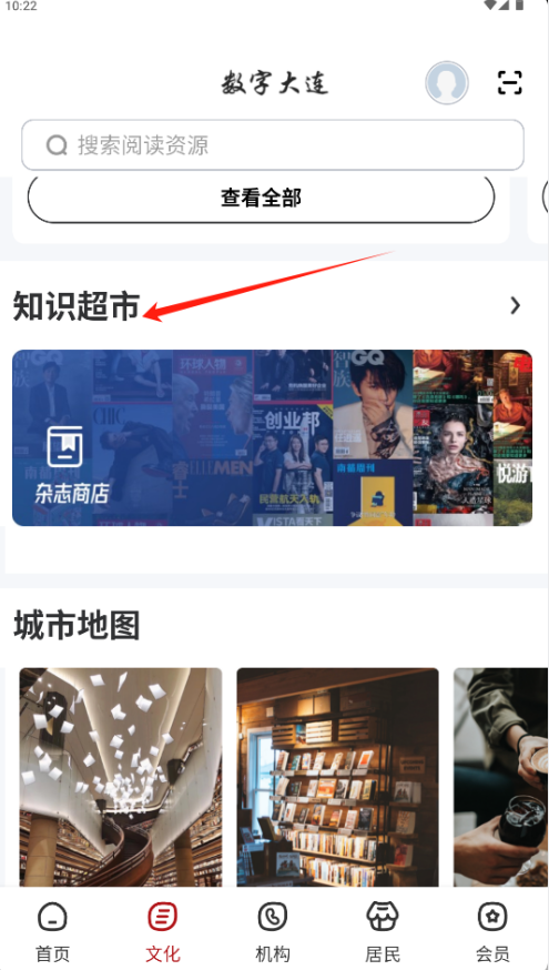 2、在文化页面找到并点击“知识超市”功能入口浏览。