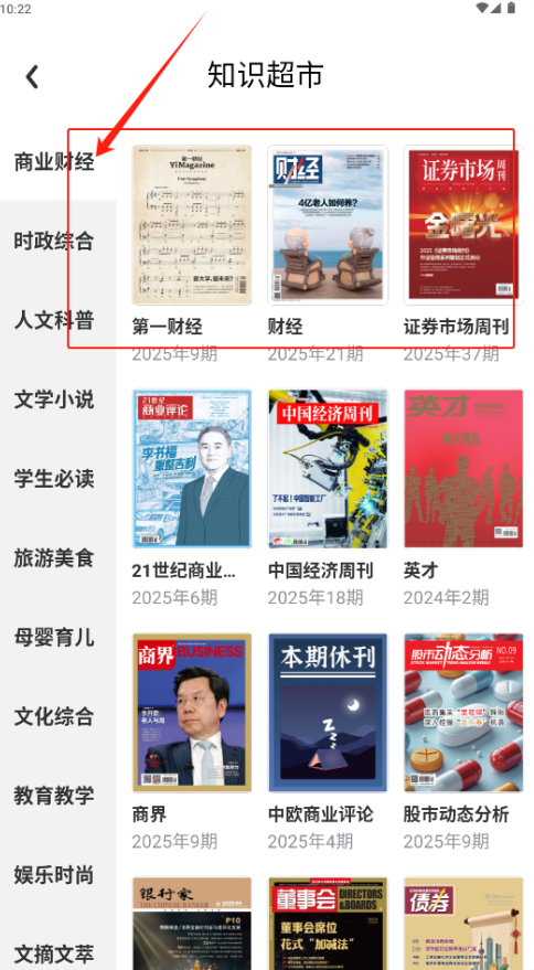 3、进入知识超市,在左侧选择“商业财经”等分类,右侧显示杂志列表供阅读选择。