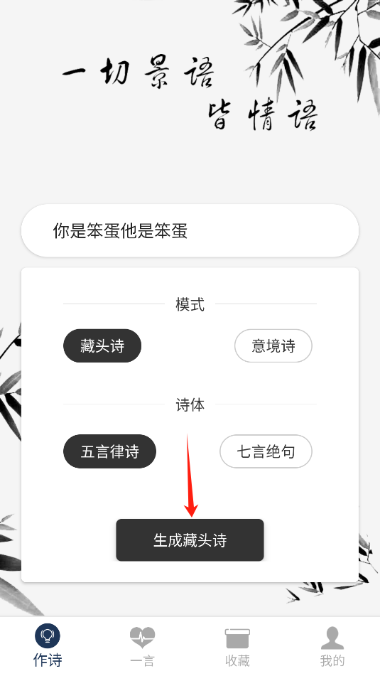 1、打开APP,可在上方最多输入8个汉字,点击藏头诗,点击生成藏头诗。