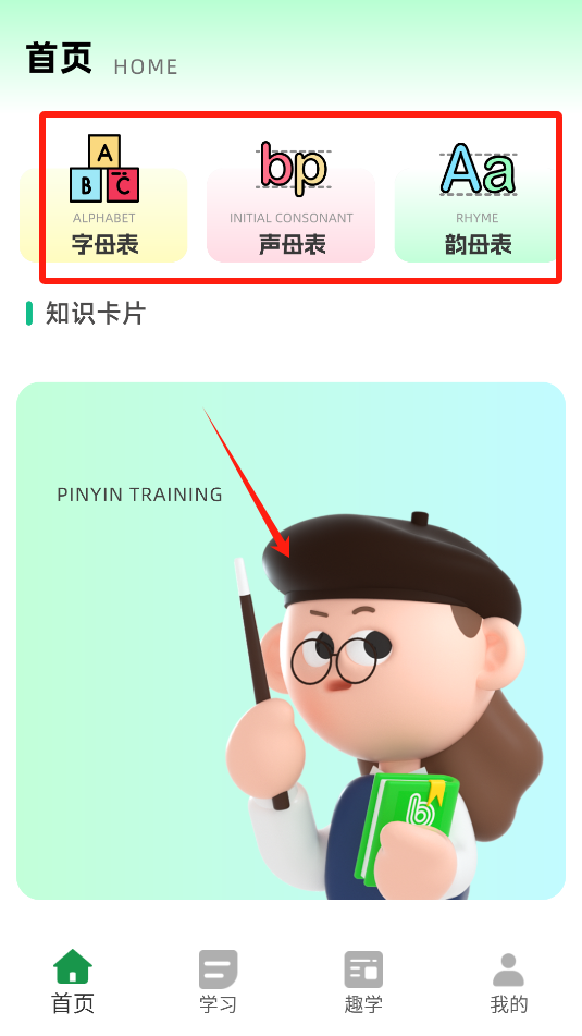1、打开APP,可点击上方的字母表、声母表、韵母表进入学习跟读,可点击下方的人物进入卡片认知。