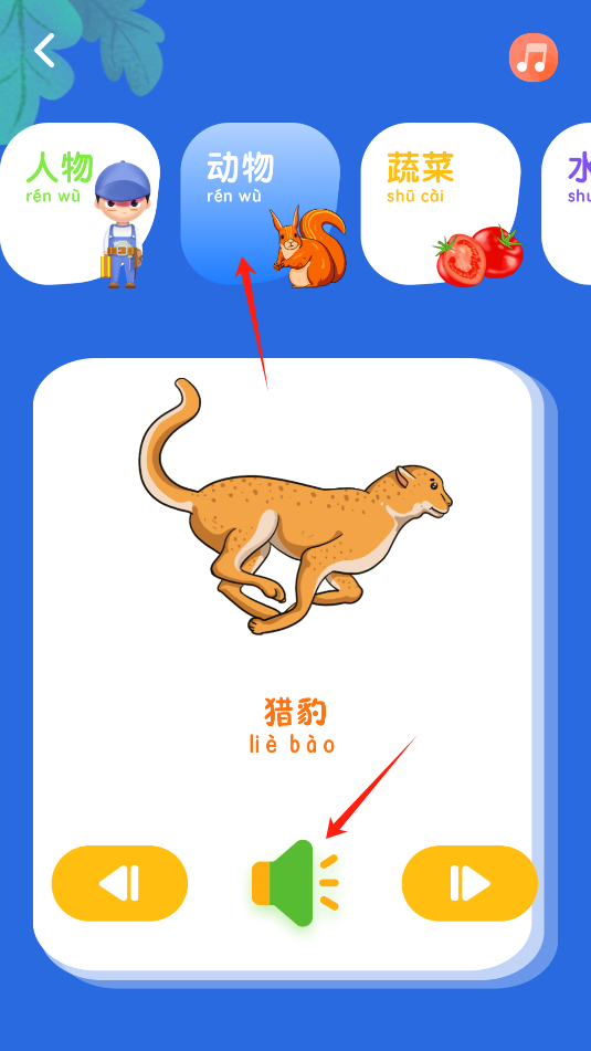 3、卡片认知里,可在上方选择学习认知的类型,点击下方的声音按钮,可跟着语音跟读和认知。