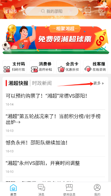 1、在应用首页“湘超快报”新闻列表中,点击新闻标题右侧“更多”。