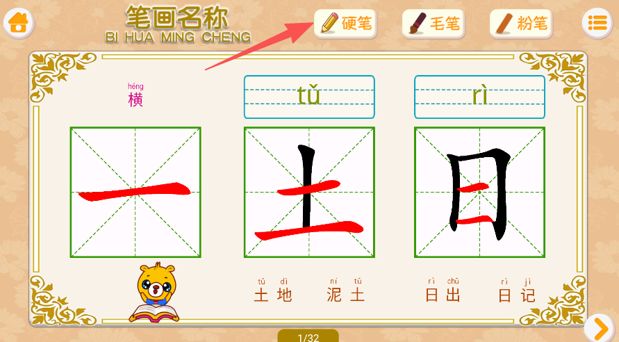1、具备笔画学习功能,支持多种笔型选择, 等汉字中的应用,助力用户学习笔画名称与书写。