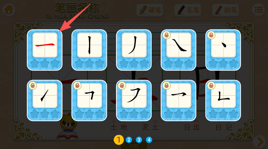 3、提供笔画分类功能,将基本笔画分类展示,用户可逐个学习,系统提升笔画认知与书写能力。