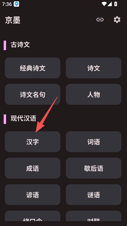 3、界面分类清晰,古诗文与现代汉语板块区分明确,各板块内功能入口直观,便于用户快速定位学习内容。