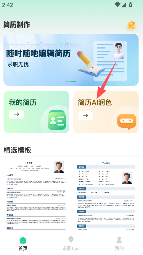 1、在选择精选模板或简历AI润色功能。