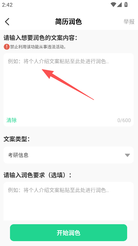 2、AI润色功能,输入简历文案,选择类型,点击开始润色,优化文案表达。