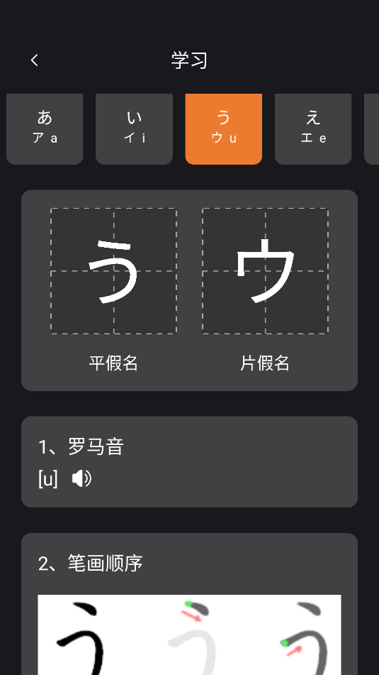 3、点击下方的声音图标可以发出五十音的读音,下方还可以学习笔画顺序。