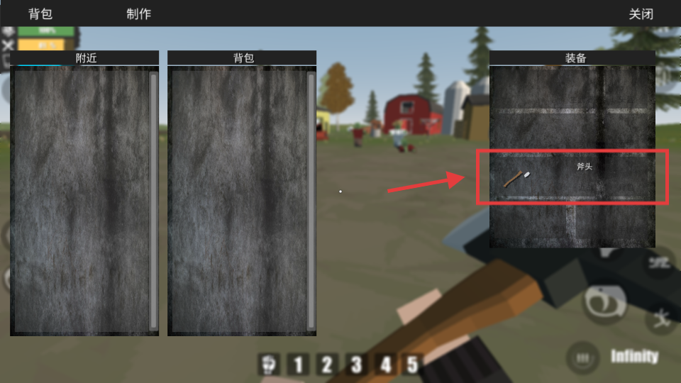2、在背包的装备栏中装备【斧头】,可用于砍伐、战斗等,提升生存能力。