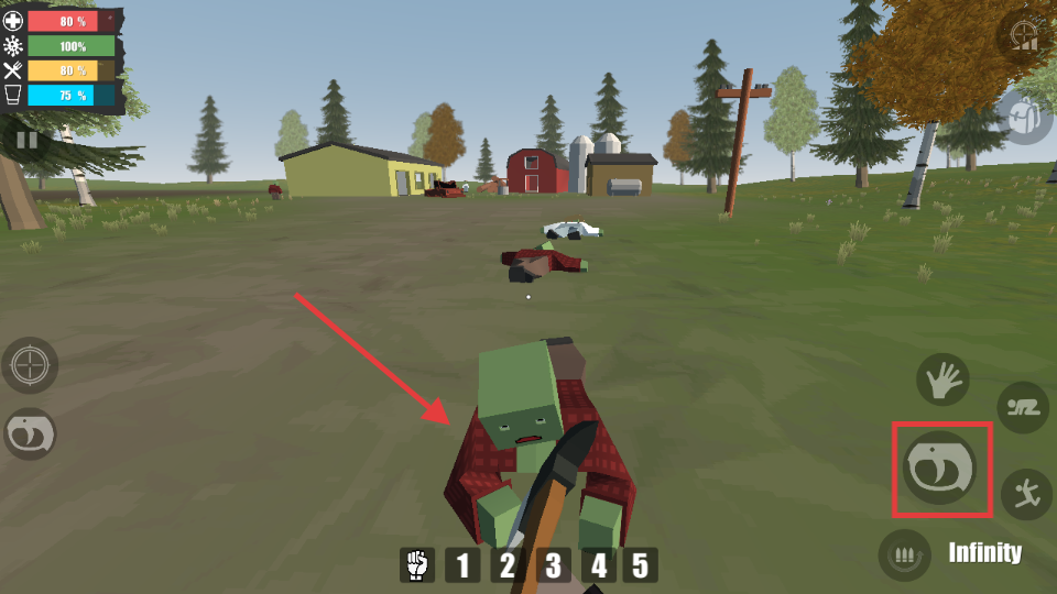 3、点击右侧攻击按钮,用【斧头】攻击僵尸等敌人,保护自己,保障生存安全。