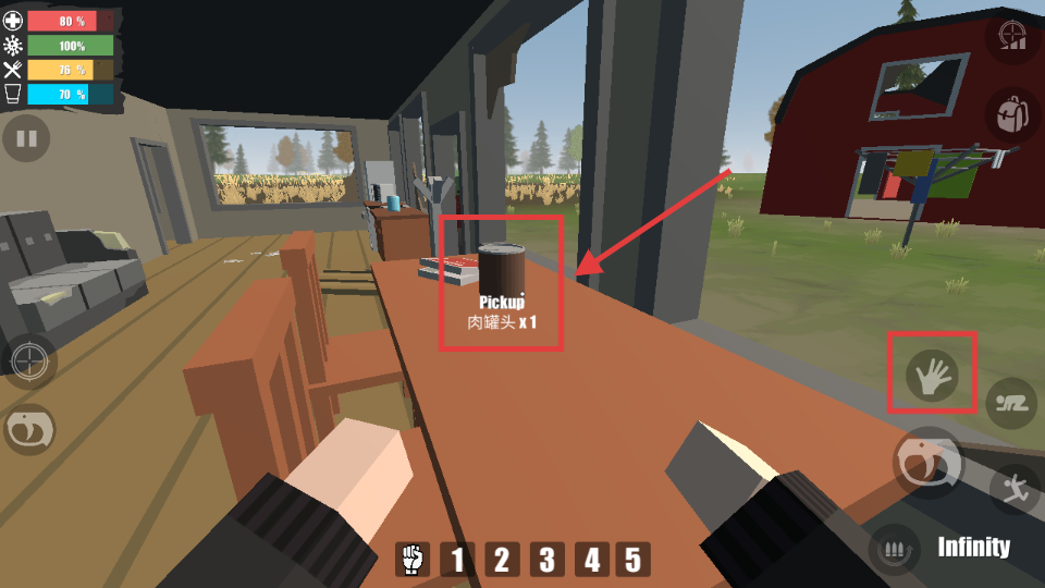 4、靠近【肉罐头x1】,点击拾取按钮收集物资,补充资源,维持角色生存状态。